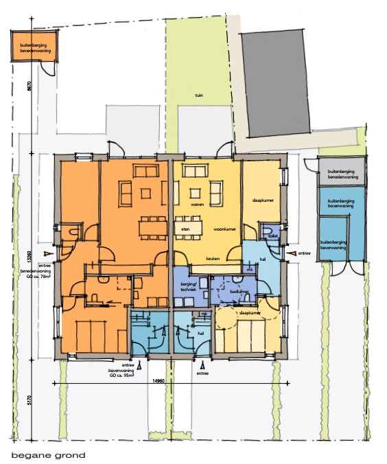 De benedenwoningen zijn geschikt voor senioren en hebben een volledig woonprogramma op de begane grond d.w.z. keuken/woonkamer/slaapkamer/badkamer, toilet e.d. Een buitenruimte komt er in de vorm van een tuin. Ook zal er een buitenberging en een parkeerplaats op eigen terrein aanwezig zijn.
